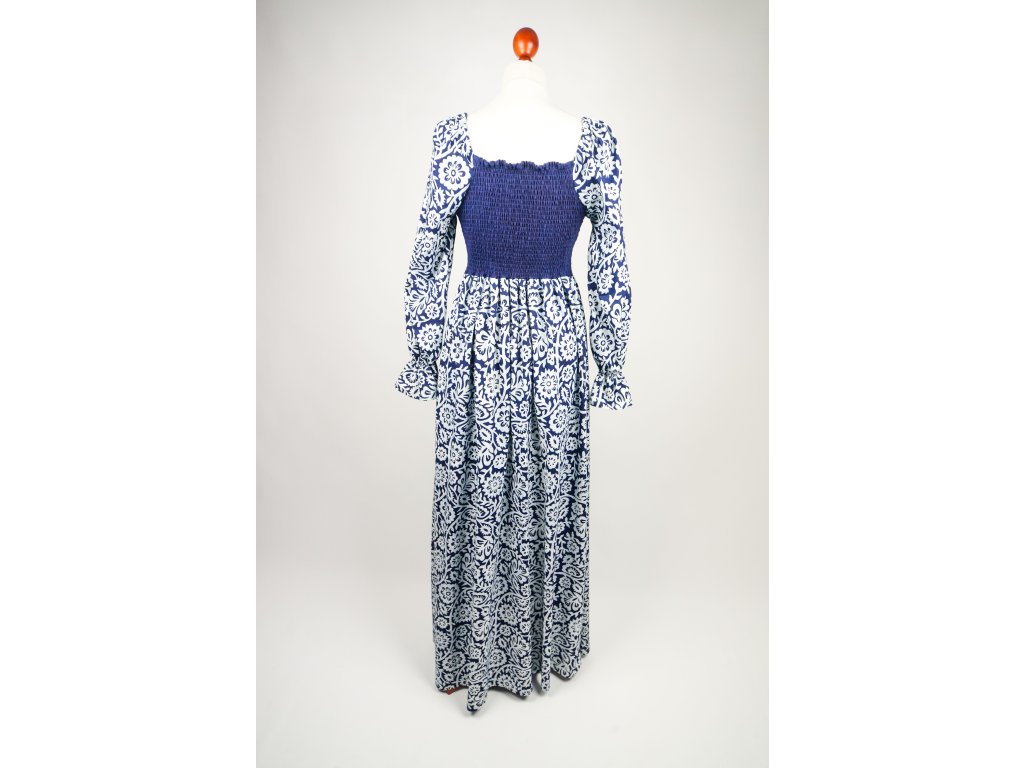 Maxi-šaty sahající až na zem nabízí variabilitu žabičkováním na zadním díle a tak dobře sedne všem a velmi lichotí. Po obou bocích jsou opatřeny kapsami.