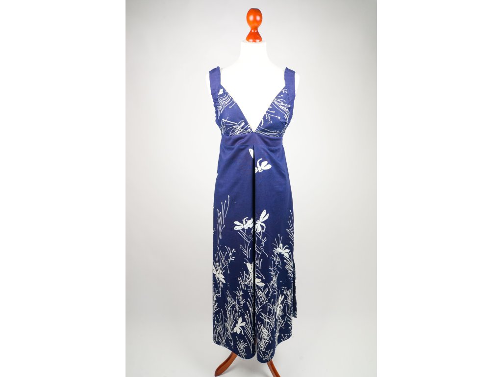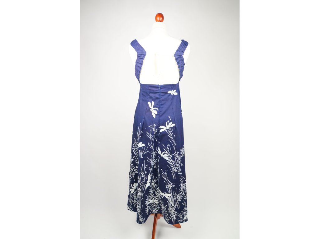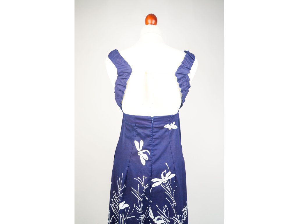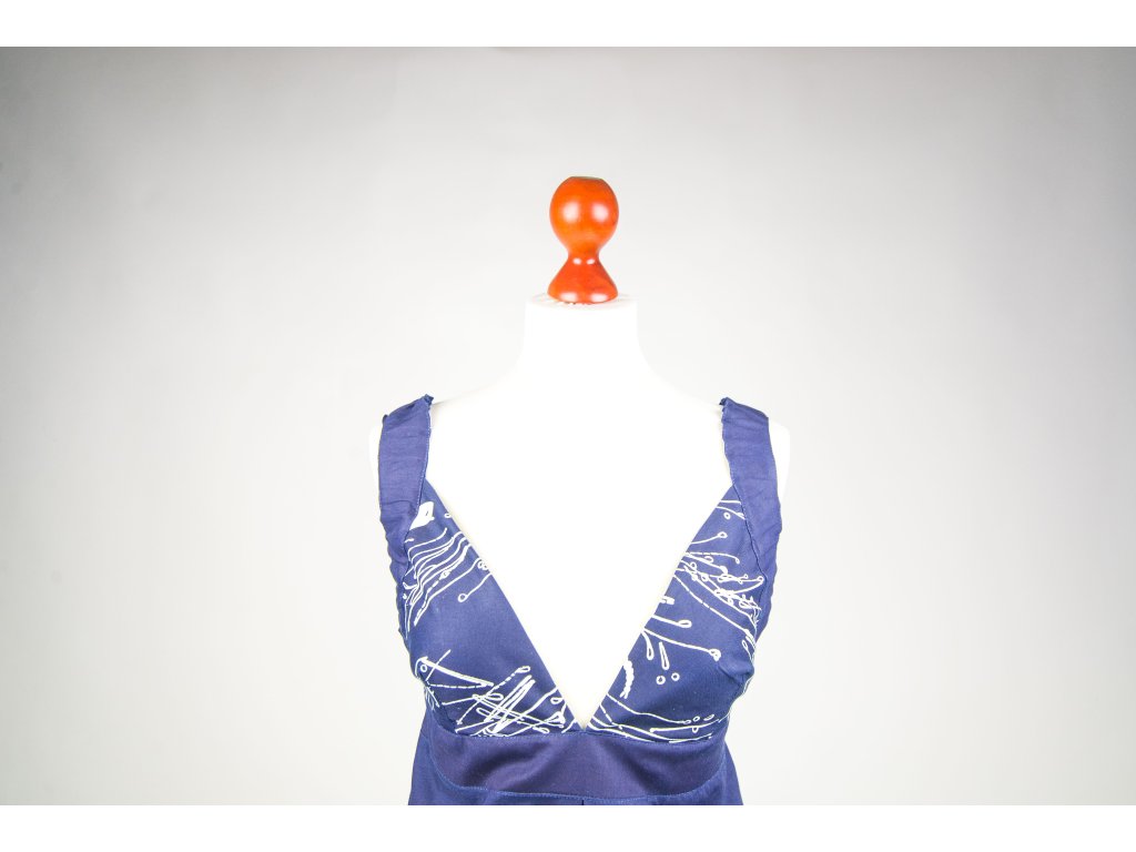 Šaty s délkou midi jsou střiženy pod prsy a pružná ramínka jsou zajištěna na zádech mašlí, aby nepadaly. Po obou bocích jsou opatřeny kapsami.