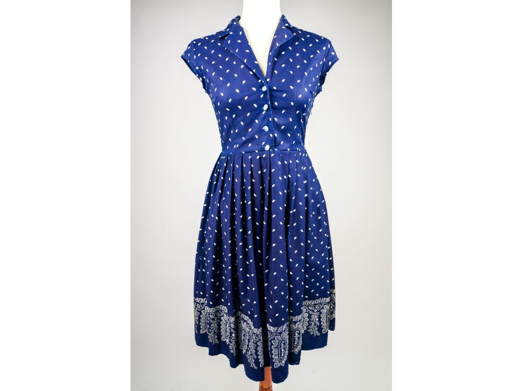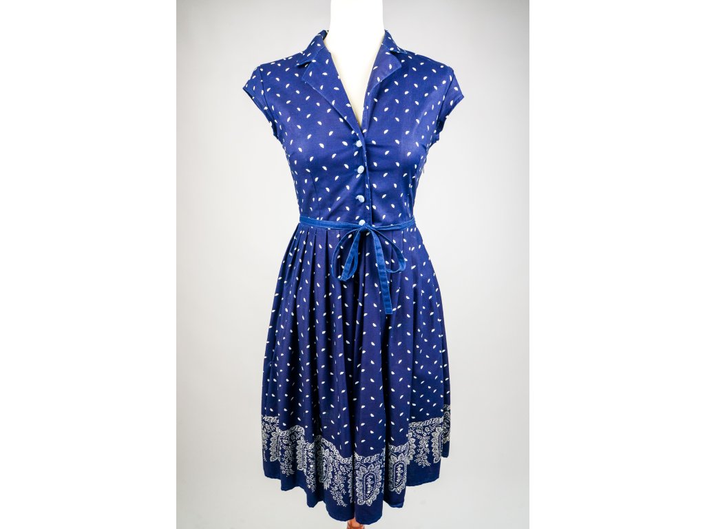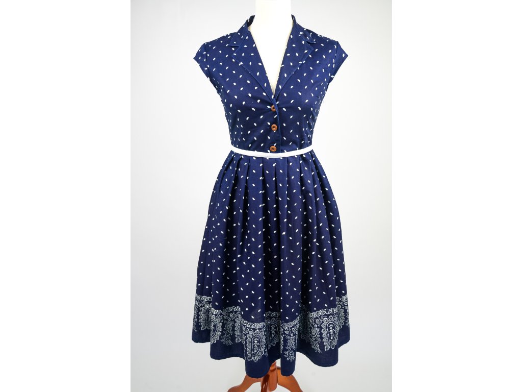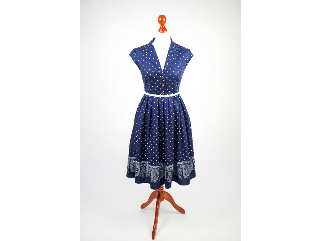 Rozhalenkové šaty s délkou po kolena mají knoflíčky na rozepínání do pasu a v boku všitý zip. Bohatá sukně je opatřena na jedné straně kapsou a je vhodná k využití bordurového tisku.