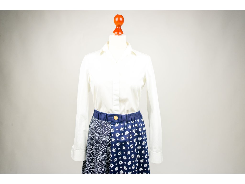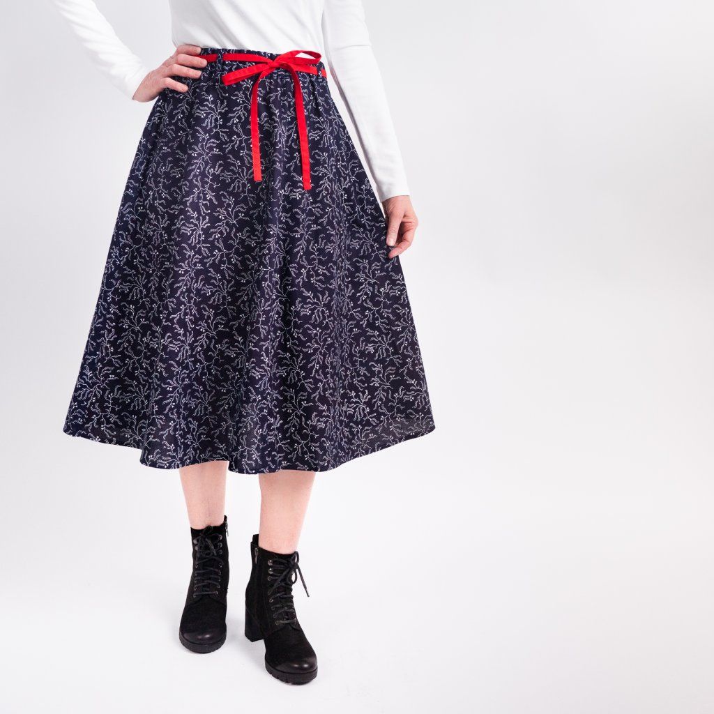 Sukně Zdena v délce po lýtka je ušitá ze čtyř dílů, které umožňují nekonečnou kombinaci vzorů, ale lze také vsadit na vzor jednotný. V pase je do gumy a poutka zajistí úzký opasek. Zapíná se vpředu na zip a knoflíček a po bocích je opatřena kapsami.